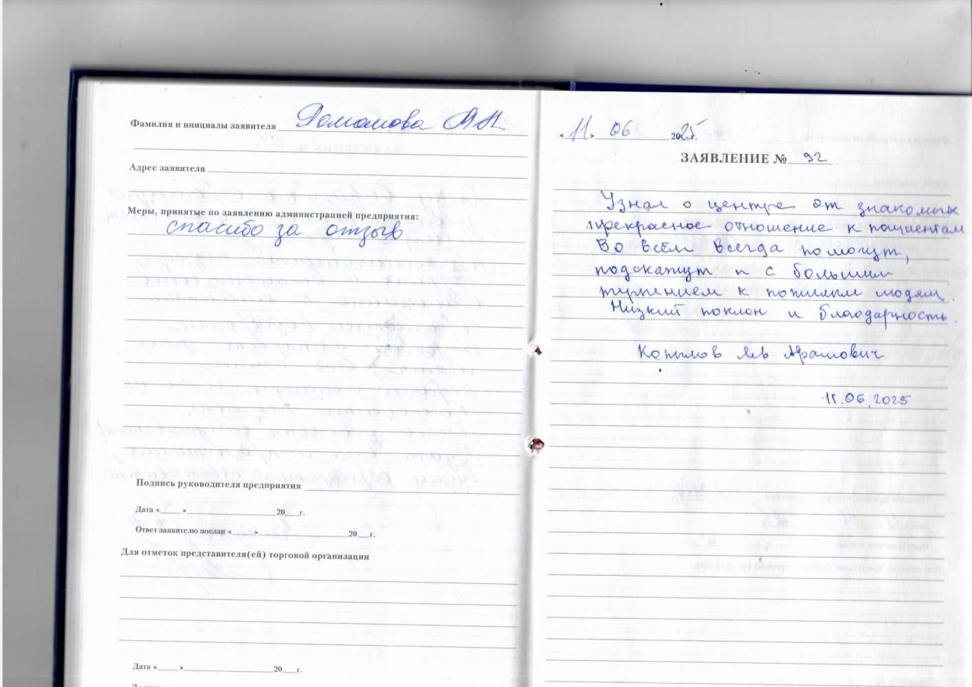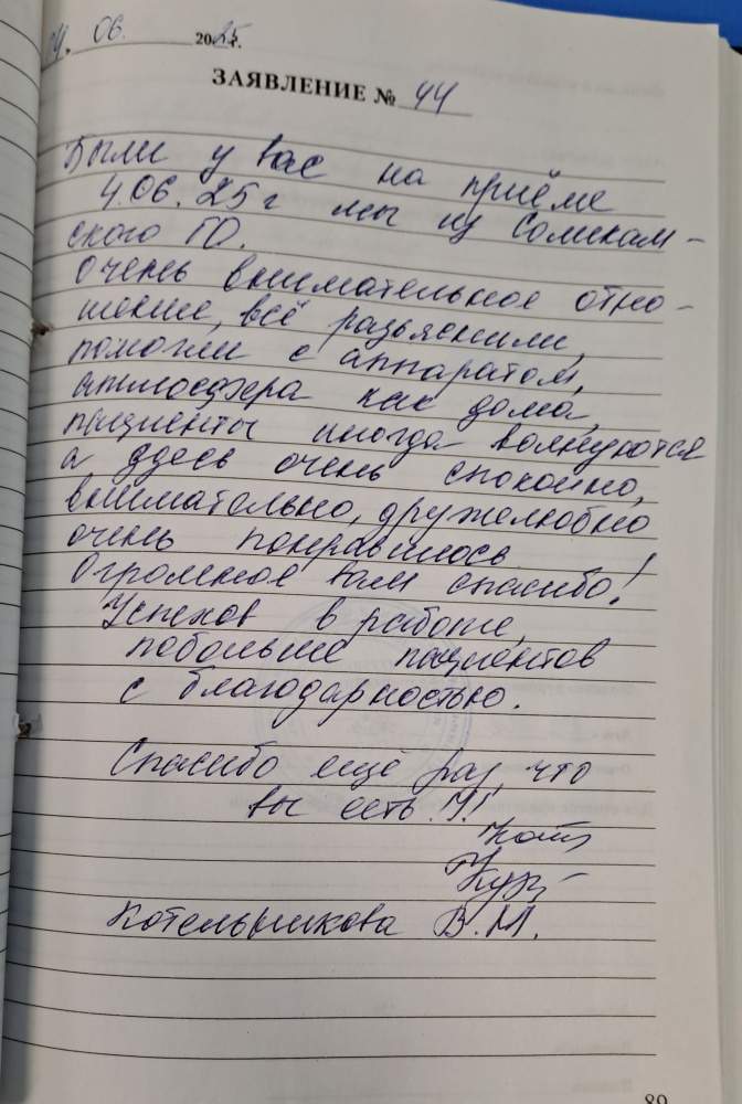 Были у вас на приеме 4.06.25г. мы из Соликамского ГО. Очень внимательное отношение, все разъяснили, помогли с аппаратом, атмосфера как дома, пациенты иногда волнуются, а здесь очень спокойно, внимательно, дружелюбно очень понравилось. Огромное вам спасибо! Успехов в работе, побольше пациентов с благодарностью. Спасибо еще раз, что вы есть.