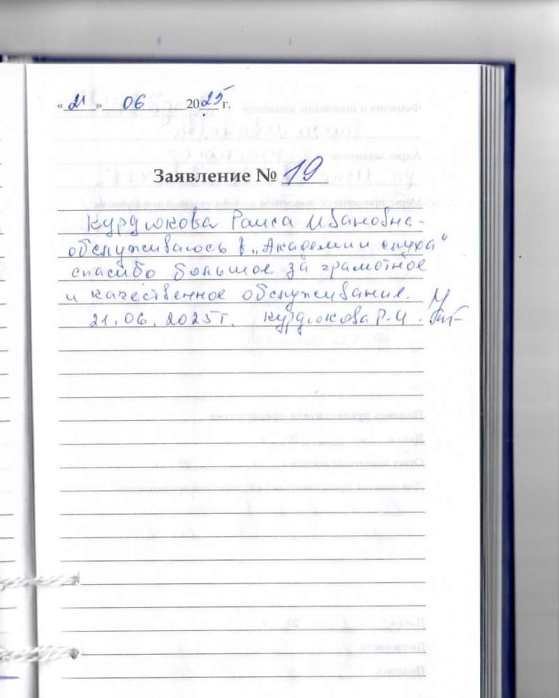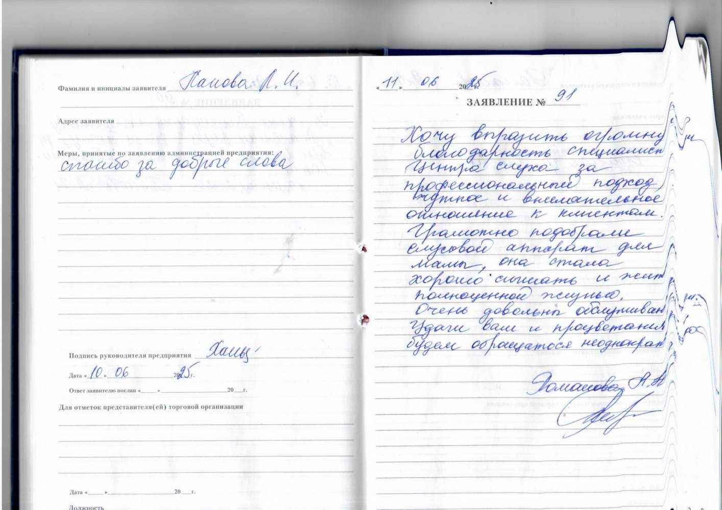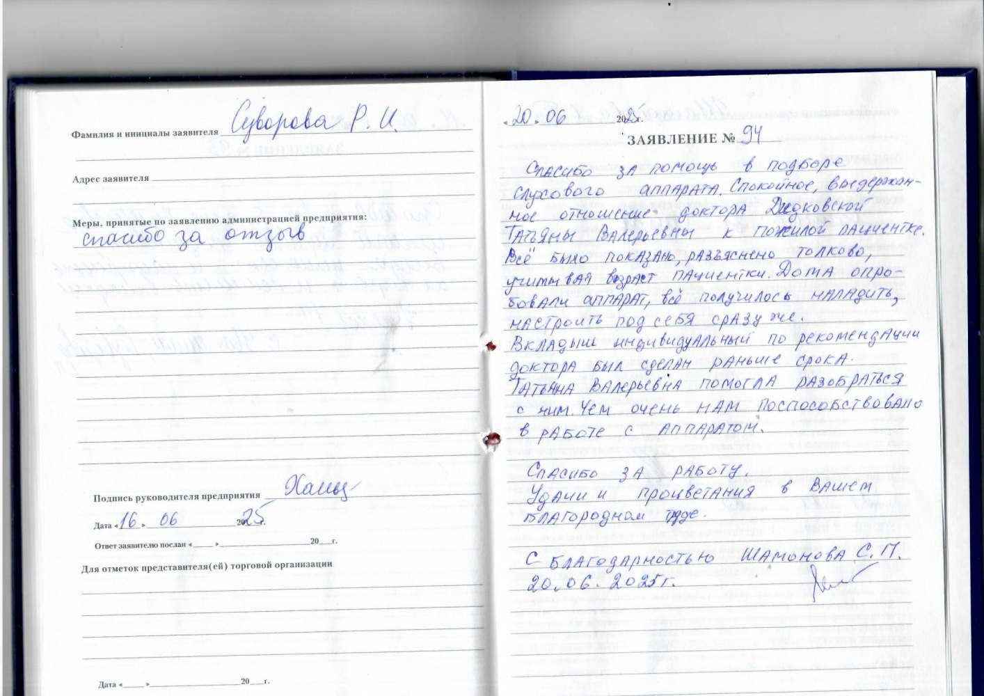Курдюкова Раиса Ивановна, обслуживаюсь в "Академии Слуха" Спасибо большое за грамотное обслуживание. 21.06.2025 Курдюкова Р.И.