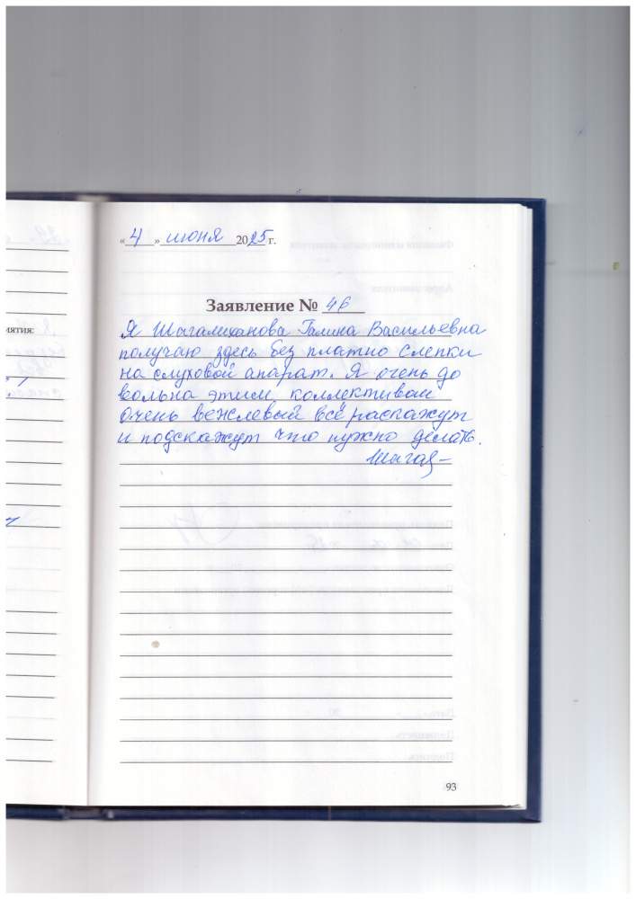 Я, Шагалиханова Галина Васильевна получаю здесь бесплатно слепки на слуховой аппарат. Я очень довольна этим коллективом, очень вежливый, все расскажут и подскажут, что нужно делать.