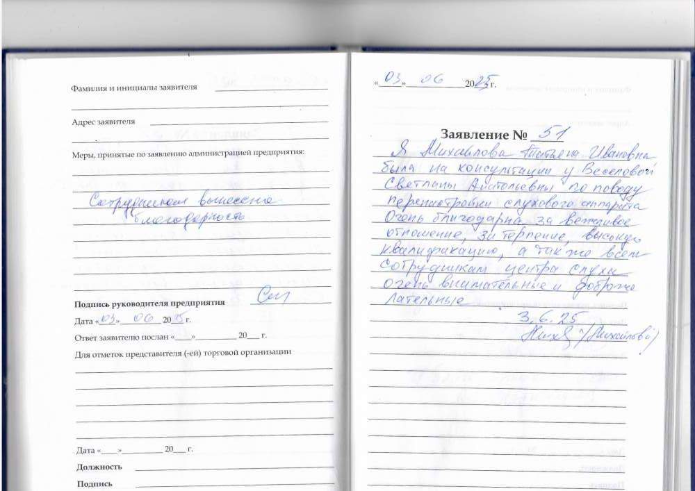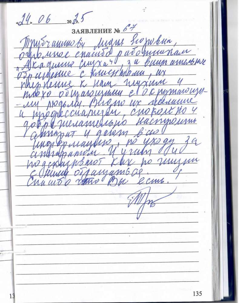 Огромное спасибо работникам «Академии слуха» за внимательное обращение с клиентами, их терпение к нам глухим и плохо общающимися с окружающими людьми. Видно их желание и профессионализм, спокойно и доброжелательно настроить аппарат и дают всю информацию, по уходу за аппаратом. И учат и подсказывают, как по жизни с ними обращаться. Спасибо, что вы есть!