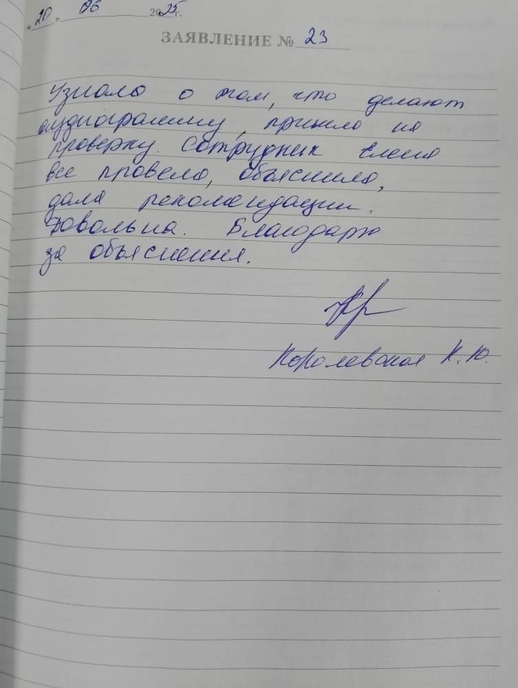 Узнала о том, что делают аудиограмму, пришла на проверку. Сотрудник Елена всё провела, объяснила, дала рекомендации. Довольна. Благодарю за объяснения. Королевская К.Ю.