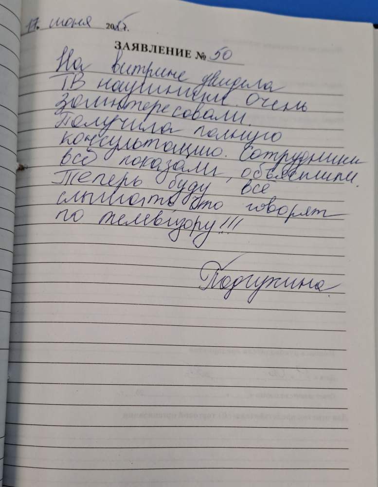 На витрине увидела ТВ наушники. Очень заинтересовали. Получила полную консультацию. Сотрудники все показали, объяснили. Теперь буду все слышать, что говорят по телевизору!!!