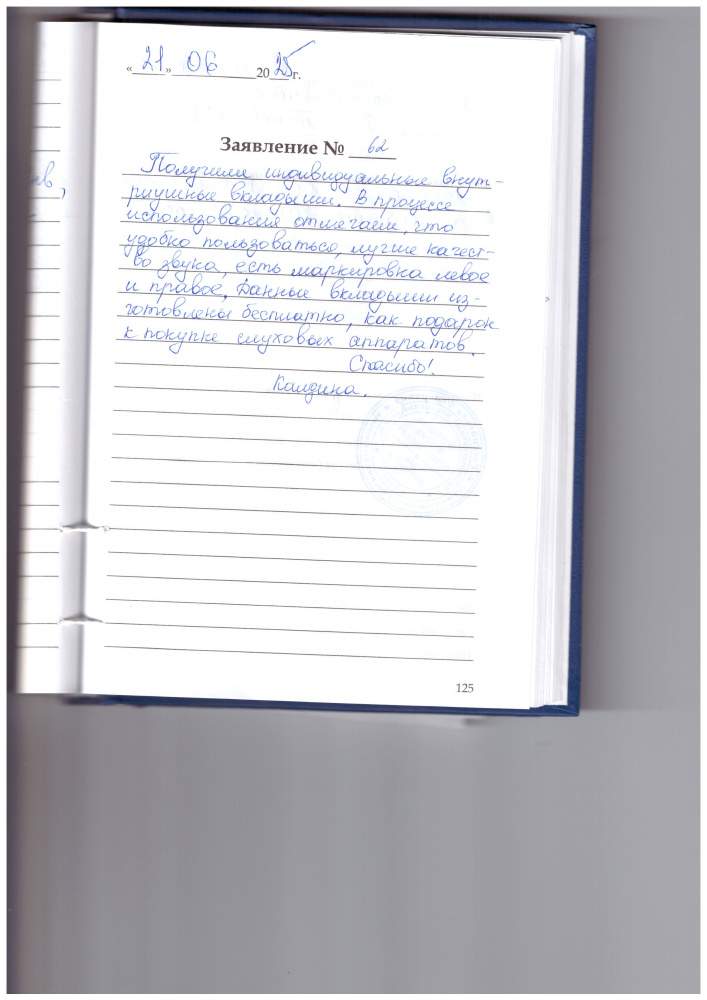 Получили индивидуальные внутриушные вкладыши.В процессе использования отмечаем,что удобно пользоваться , лучше качество звука , есть маркировка левое и правое,Данные вкладыши изготовлены бесплатно,как подаро к покупке СА .Спасибо