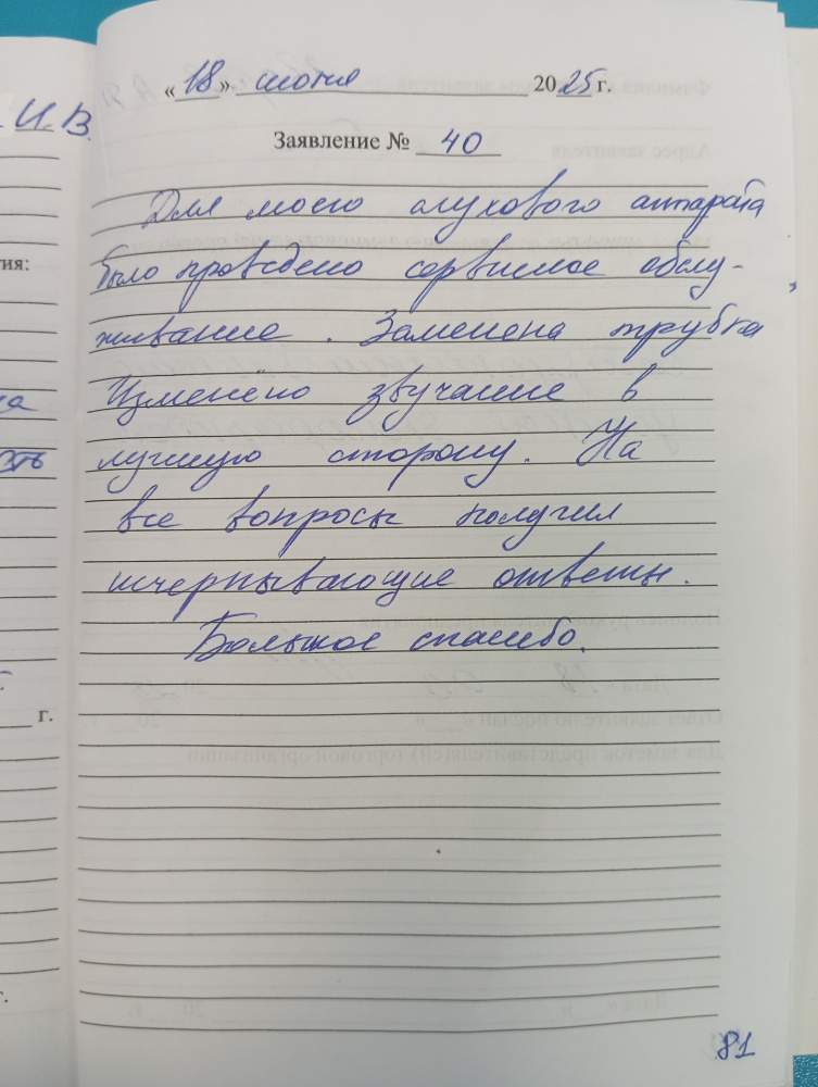 Для моего слухового аппарата было проведено сервисное обслуживание:замена трубочки, изменено звучание в лучшую сторону. На все вопросы получил исчерпывающие ответы. Большое спасибо.