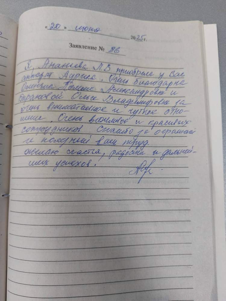 Я, Ананьева Л.В. приобрела у Вас аппарат Аурика. Очень благодарна Оленчик Полине Александровне и Барановой Ольге Владимировне за очень внимательное и чуткое отношение, очень вежливых и красивых сотрудников.