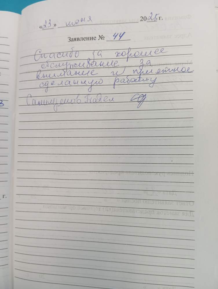 Спасибо за хорошее обслуживание, за внимание и приятно сделанную работу.