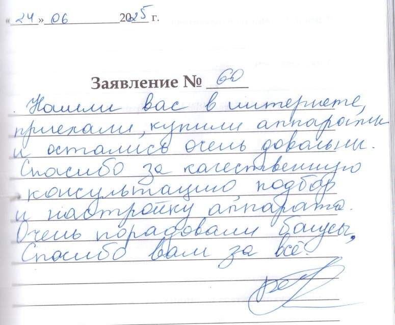 Нашли вас в интернете, приехали, купили аппараты и остались очень довольны. Спасибо за качественную консультацию, подбор и настройку аппарата. Очень порадовали бонусы. Спасибо вам за все.