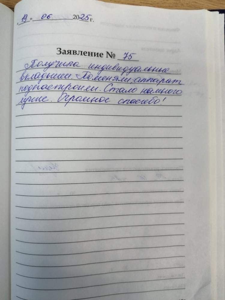 Получила индивидуальные вкладыши. Поменяли, аппарат поднастроили. Стало намного лучше. Огромное спасибо!