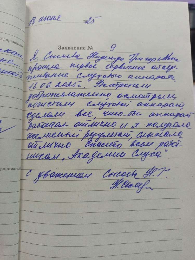 Я, Сысоева Надежда Григорьевна, прошла первое сервисное обслуживание слухового аппарата 18.06.2025. Встретили доброжелательно, осмотрели, почистили слуховой аппарат. Сделали все, чтобы аппарата работал отлично. И я получила желаемый результат, слышала отлично. Спасибо, всем работникам «Академии Слуха» С уважением Сысоева Н.Г.