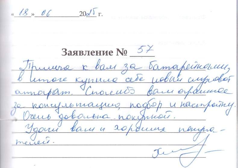 Пришла к вам за батарейками, в итоге купила себе новый слуховой аппарат. Спасибо вам огромное за консультацию, подбор и настройку. Очень довольна покупкой. Удачи вам и хороших покупателей.