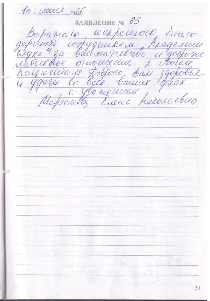 Выражаю искреннюю благодарность сотрудникам «Академии слуха» за внимательное и доброжелательное отношение к своим пациентам. Доброго Вам здоровья и удачи во всех ваших делах.