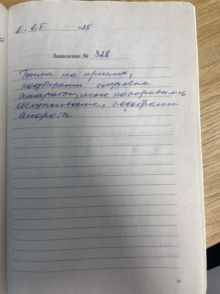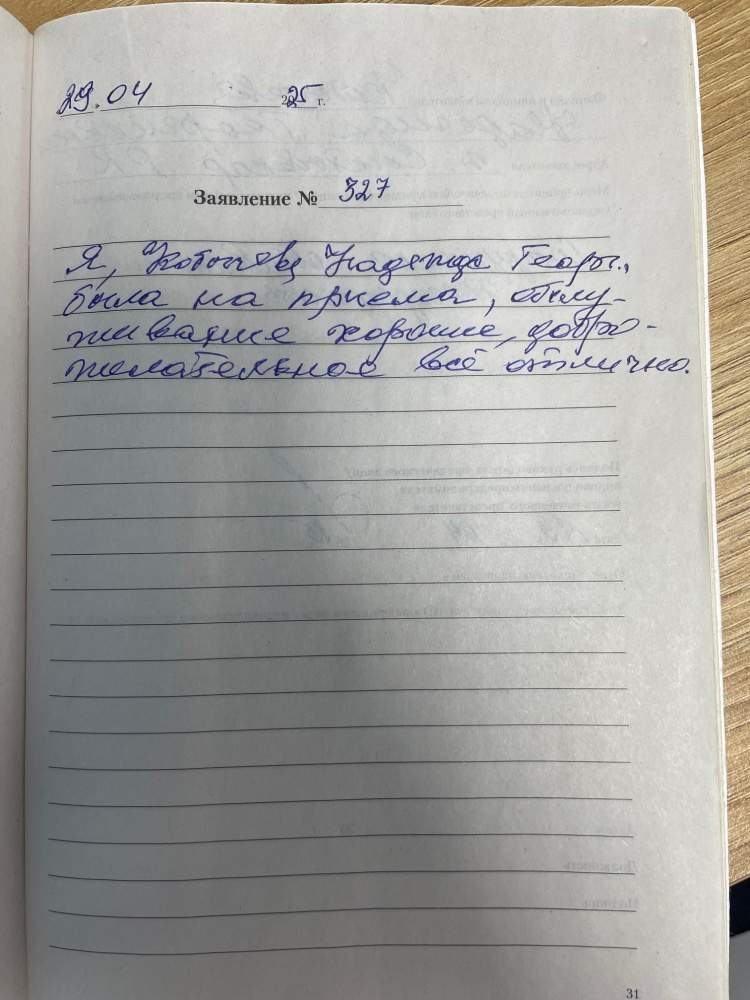 29.04.2025 Я, Кобычева Надежда Георг.,была на приеме,обслуживание хорошее, доброжелательное все отлично.