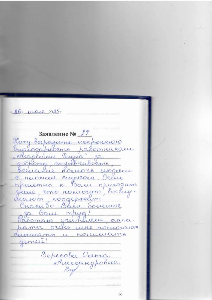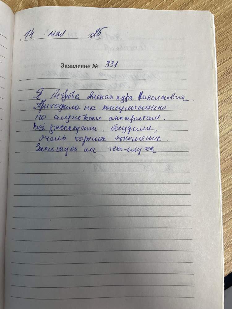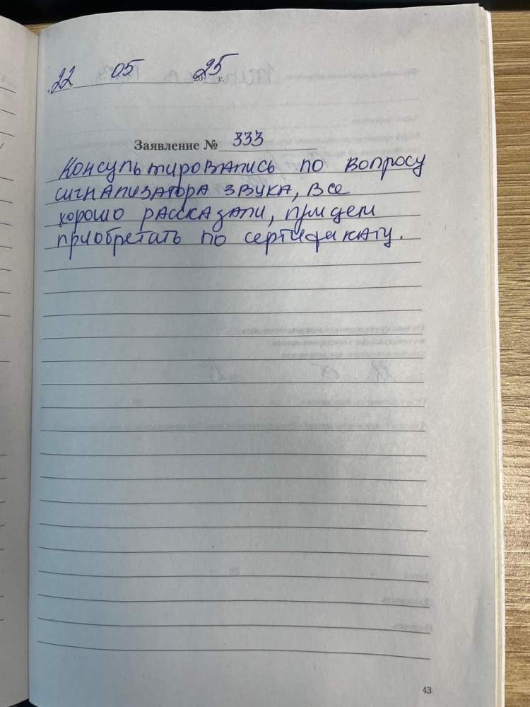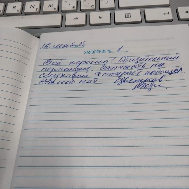 14.05.2025 Я, Петрова Александра Николаевна. Приходила на консультацию по слуховым аппаратам.Все рассказали, обсудили, очень хорошее отношение. Запишусь на тест- слуха.