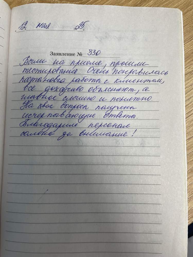 12.05.2025 Были на приеме, прошли тестирование. Очень понравилось постановка работы с клиентом, все доходчиво объясняют, а главное слышно и понятно.На все вопросы получены исчерпывающие ответы. Благодарим персонал салона за внимание!