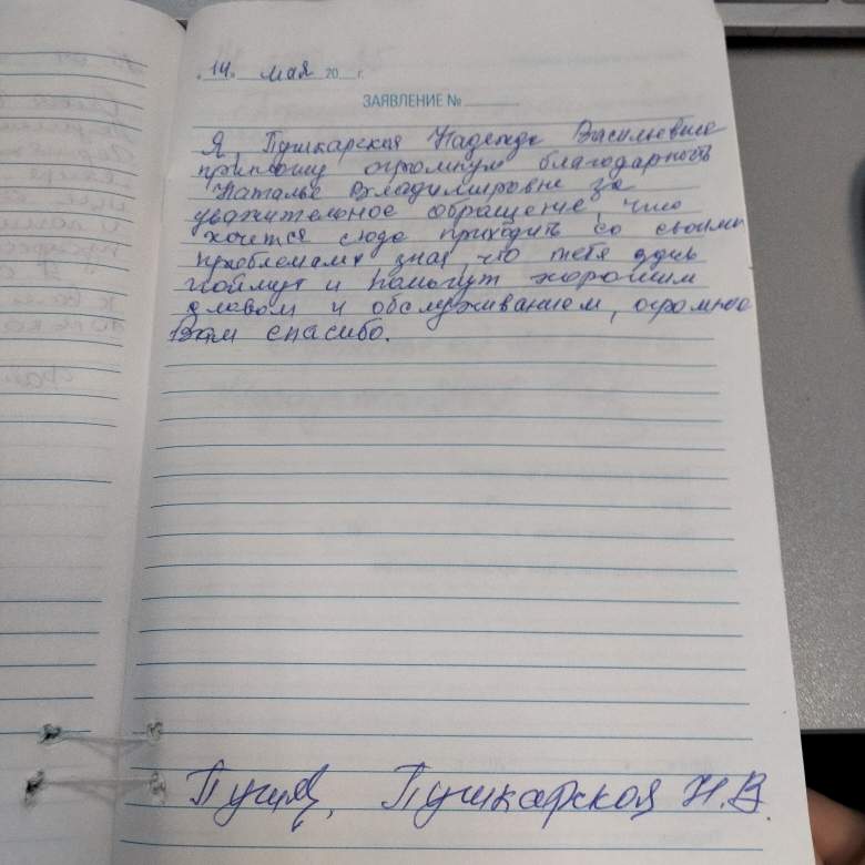 Я, Пушкарская Надежда Васильевна, приношу огромную благодарность Наталье Владимировне за уважительное общение, что хочется сюда приходить со своими проблемами, зная, что тебя здесь поймут и помогут хорошим словом и обслуживанием, огромное Вам спасибо.