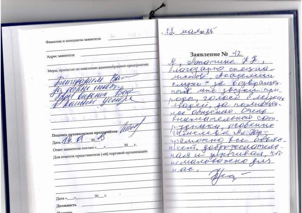 Я, Лопатина Н. Н., благодарю специалистов "Академии слуха" за возвращенные мне звуки природы, голоса близких людей, за полноценное общение. Очень внимательные сотрудники, особенно Шмелевой Ан. Юр.-грамотно все объясняет, доброжелательная и улыбчивая, что немаловажно для нас.