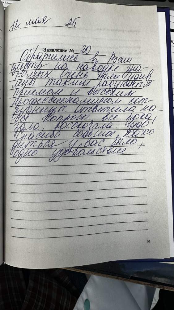 Обратилась в Ваш центр по наводке знакомых. очень были удивлены таким радушным приемом и высоким профессионализмом сотрудницы. Ответила на все вопросы, все показала, рассказала. Чудо! Спасибо большое, находиться у вас было одно удовольствие!
