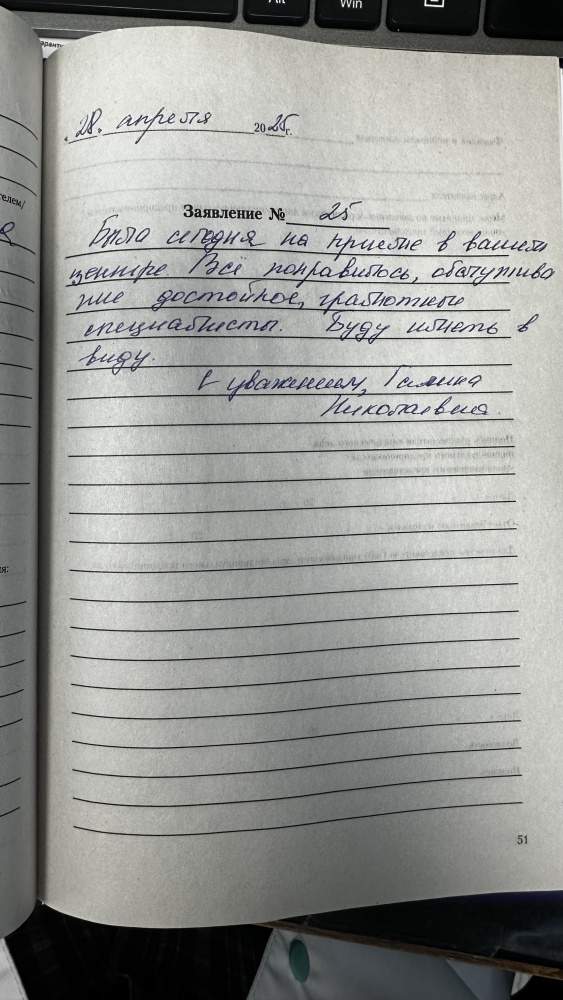 Была сегодня на приёме в вашем центре. Всё понравилось, обслуживание достойное, грамотные специалисты. Буду иметь в виду. С уважением, Галина Николаевна.