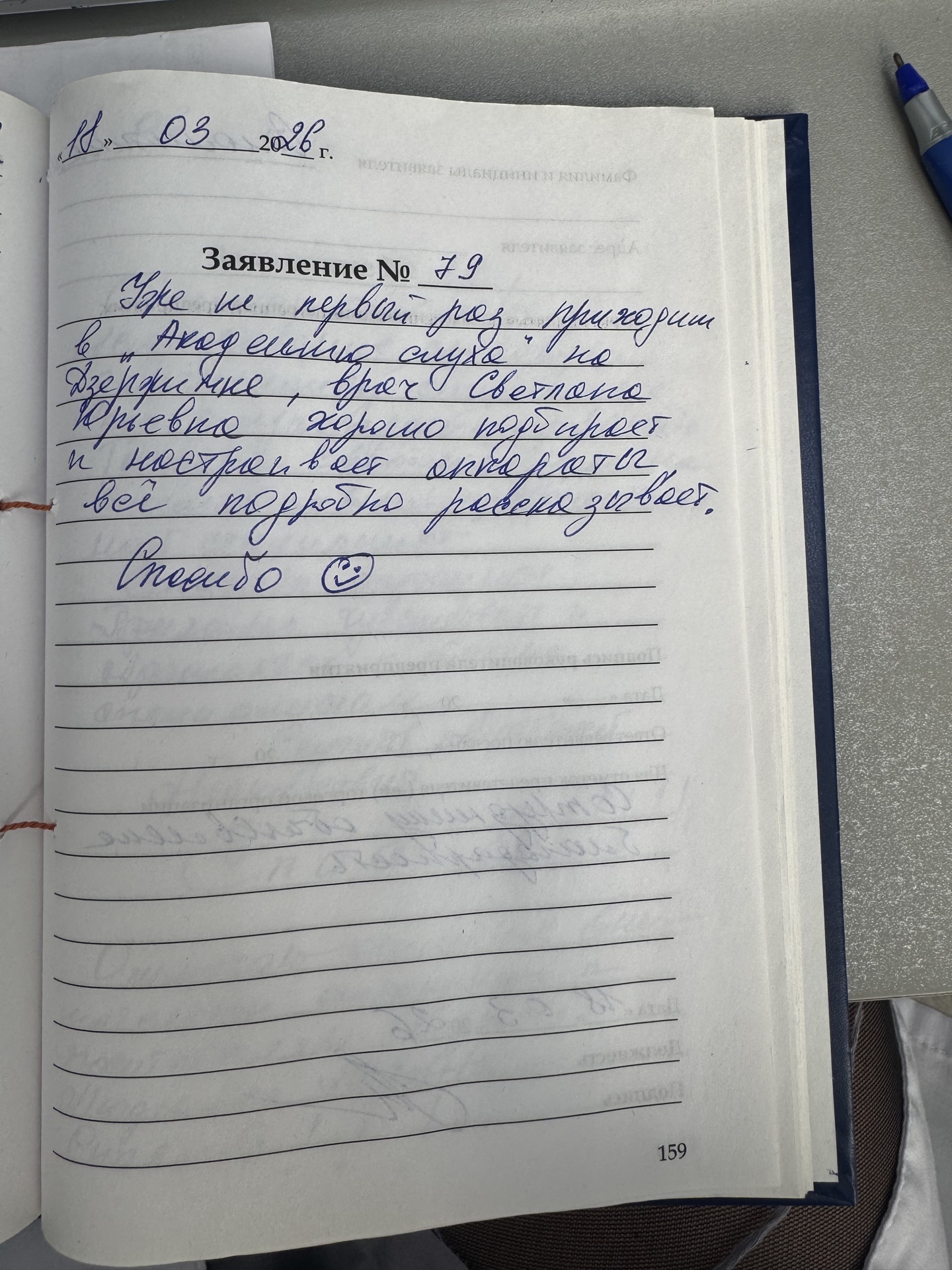 хотим поблагодарить клинику "Академия слуха" и в частности Титкову Светлану Юрьевну за очень качественную консультацию, профессионализм, доброе отношение к своим пациентам. мы очень Вам благодарны.