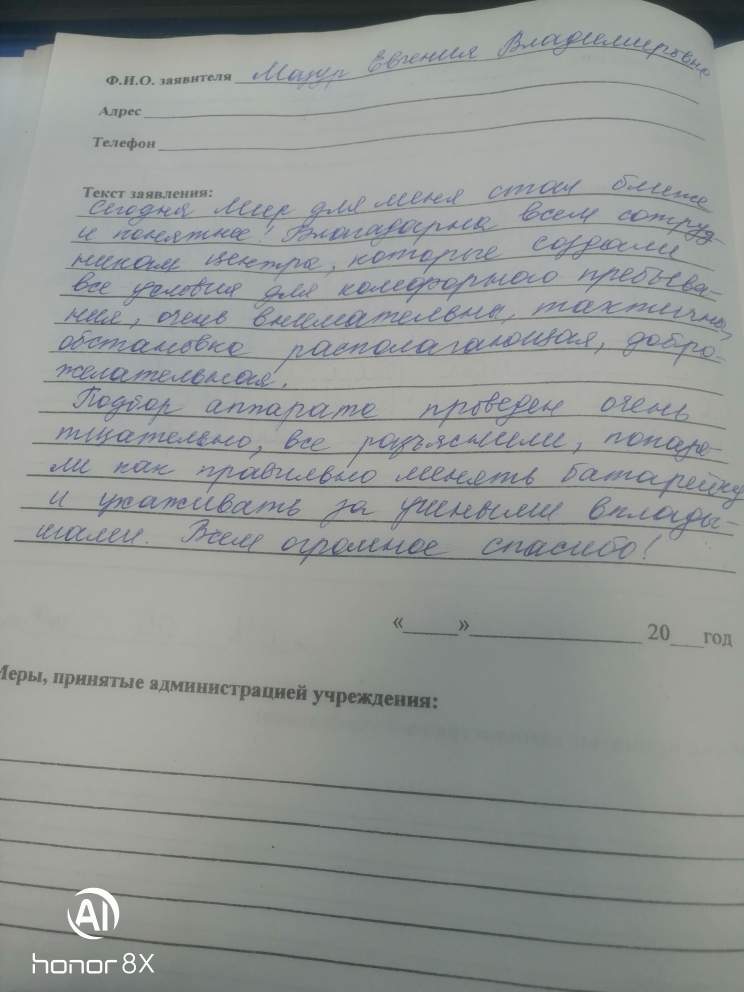 Сегодня Мир для меня стал ближе и понятнее! Благодарна всем сотрудникам центра, которые создали все условия для комфортного пребывания, очень внимательны, тактичны, обстановка располагающая, доброжелательная. Подбор аппарата проведен очень тщательно, все разъяснили, показали как правильно менять батарейку и ухаживать за ушными вкладышами. всем огромное спасибо.