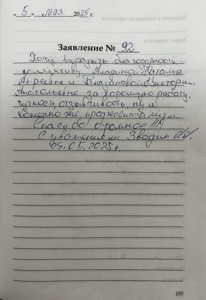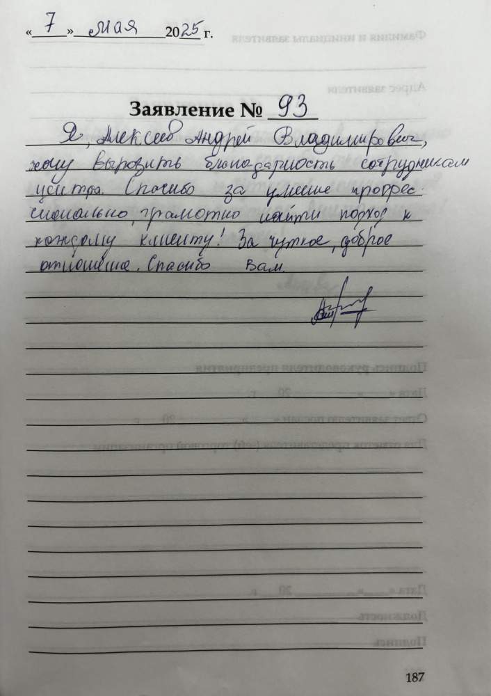 Я, Алексеев Андрей Владимирович, хочу выразить благодарность сотрудникам центра. Спасибо за умение профессионально, грамотно найти подход к каждому клиенту! За чуткое, доброе отношение. Спасибо Вам.