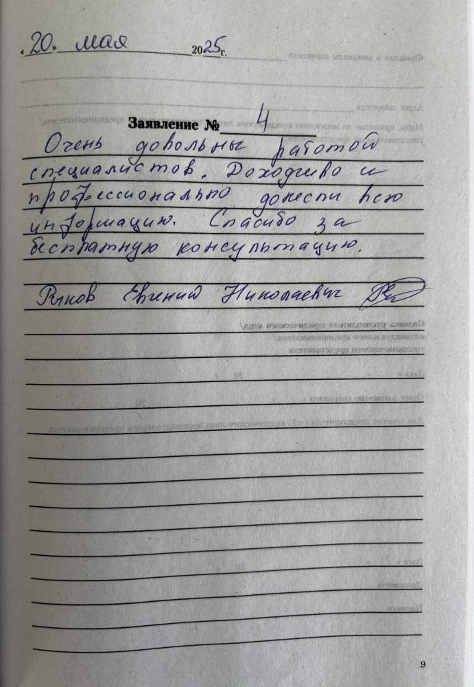 Очень довольны работой специалистов. Доходчиво и профессионально донесли всю информацию. Спасибо за бесплатную консультацию.