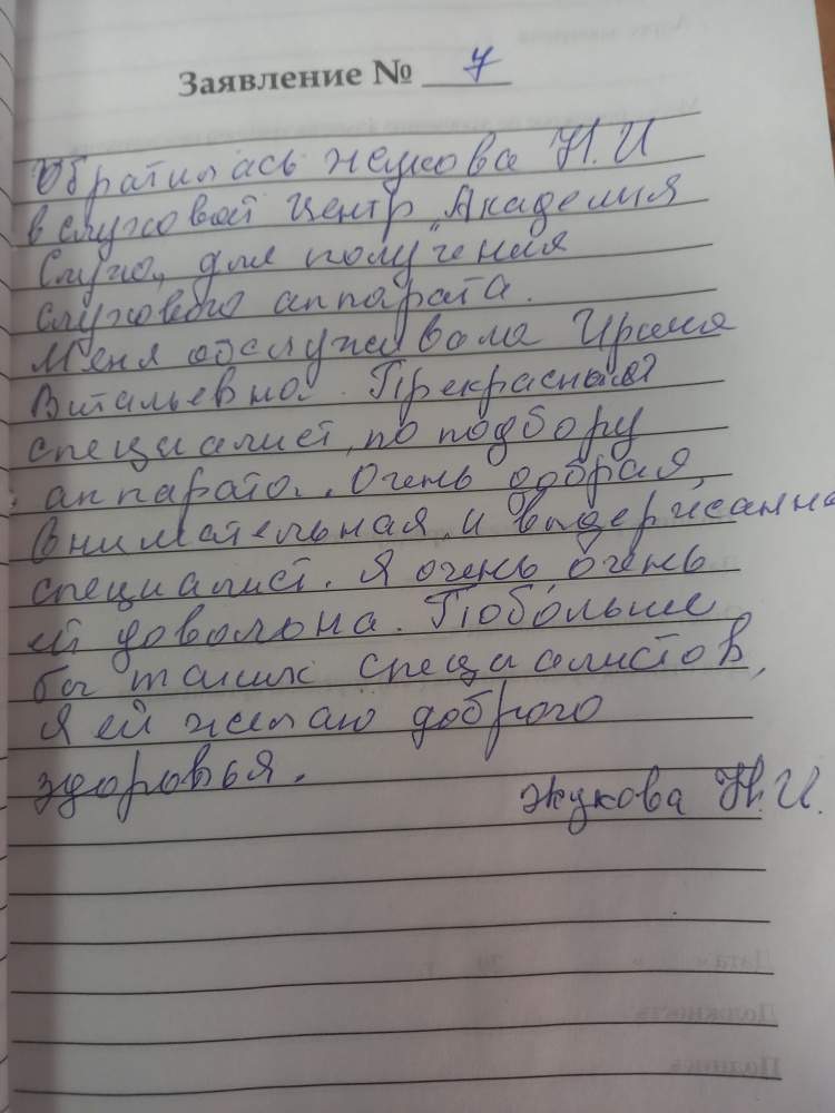 Обратилась Жукова Н.И. в слуховой центр Академия слуха для получения слухового аппарата. Меня обслуживала Ирина Витальевна. Прекрасный специалист по подбору аппарата. Очень добрая, внимательная и выдержанный специалист. Я очень, очень ей довольна. Побольше бы таких специалистов. Я ей желаю доброго здоровья.