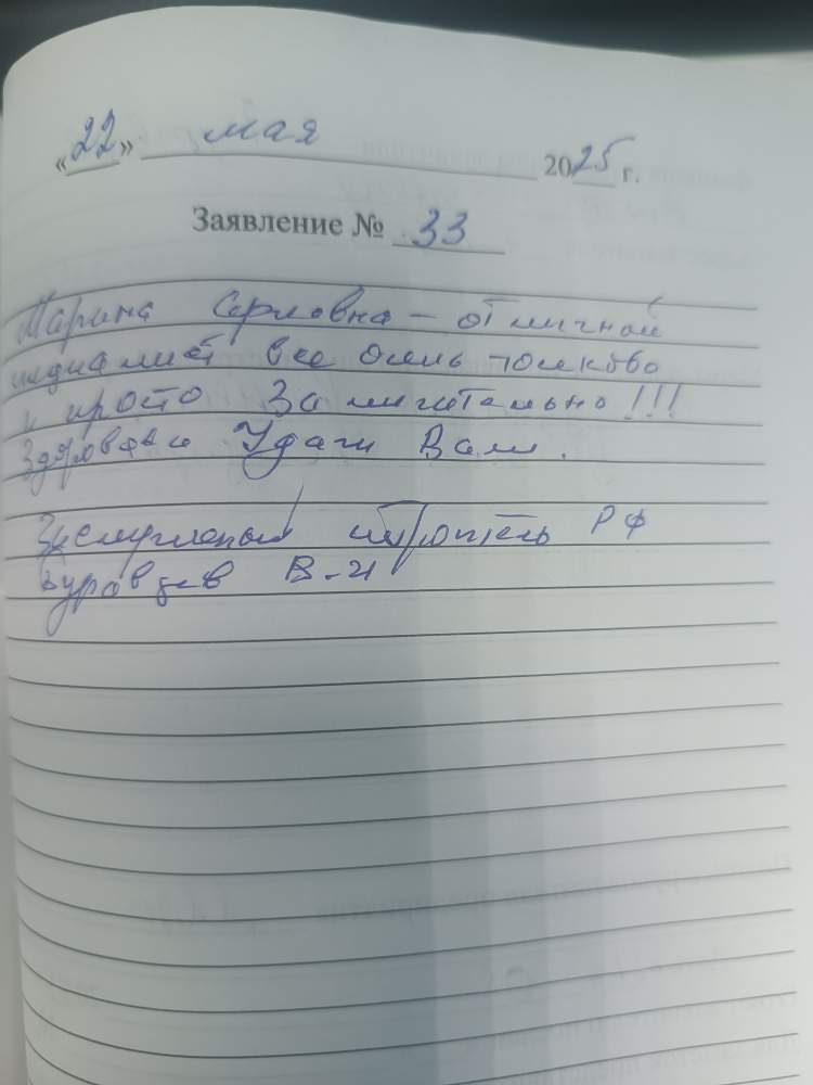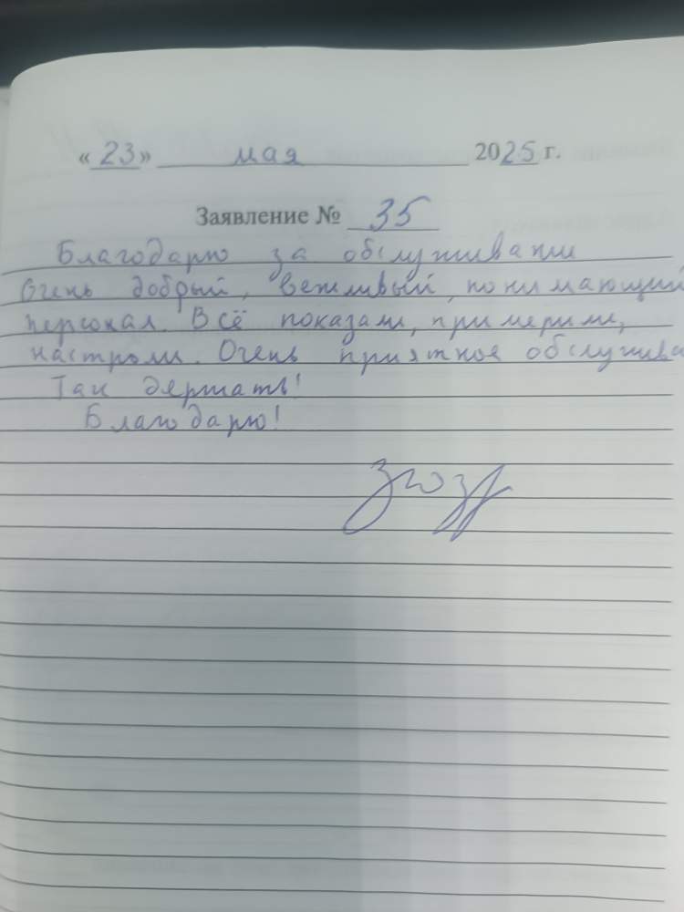 Благодарю за обслуживание. Очень добрый, вежливый, понимающий персонал. Очень приятное обслуживание. Так держать! Благодарю!