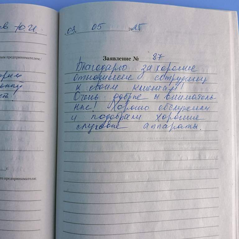 Большое спасибо за консультацию и настройку слухового аппарата. Спасибо за доброжелательное отношение в процессе обслуживания за четкость и понимание. Было приятно посетить этот слуховой центр.