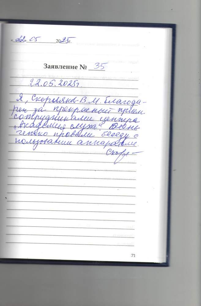 Я, Скорияков В.М. благодарен за прекрасный прием сотрудниками центра Академия Слуха .Очень четко провели беседу о пользовании аппаратами.