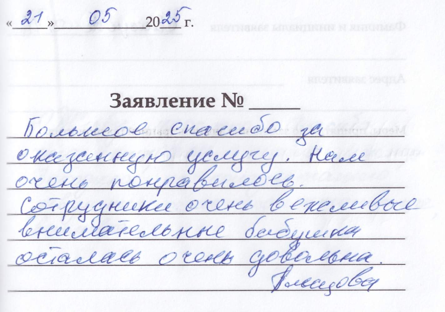 Большое спасибо за оказанную услугу. Нам очень понравилось. Сотрудники вежливые внимательные бабушка осталась довольна.