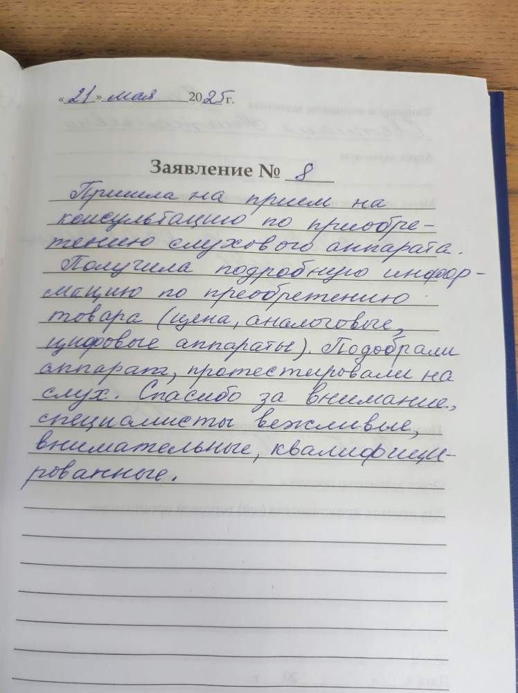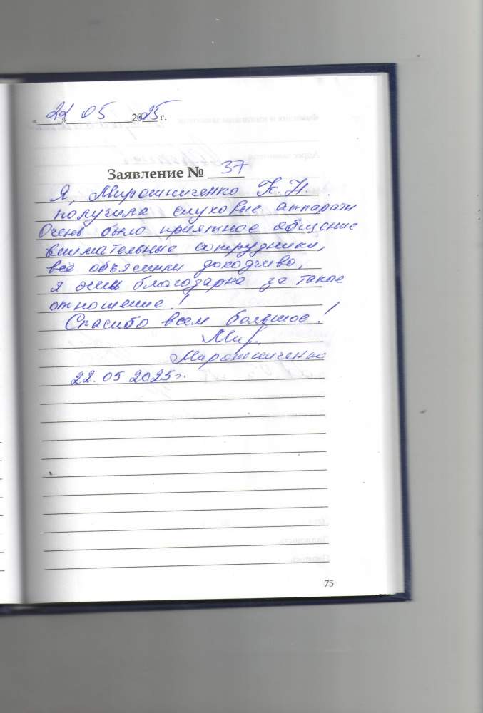 Я, Мирошниченко К.Н. получила слуховые аппараты. Очень было приятное обслуживание ,внимательные сотрудники, все объяснили доходчиво , я очень благодарна за такое отношение! Спасибо всем большое!