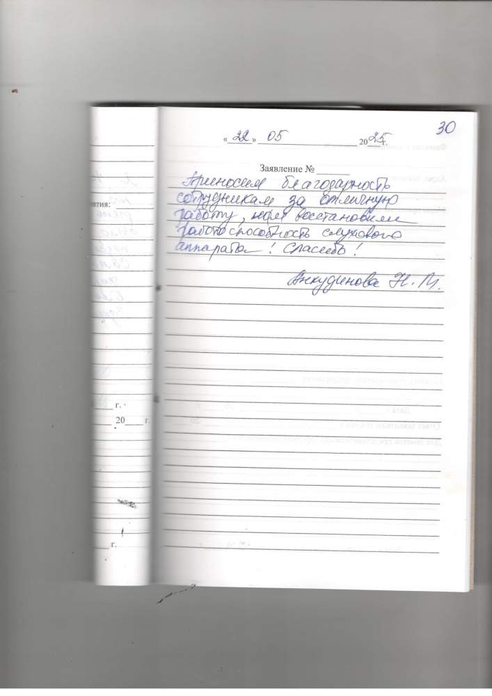 Приносим благодарность сотрудникам за отличную работу ,нам восстановили работоспособность слухового аппарата! Спасибо!