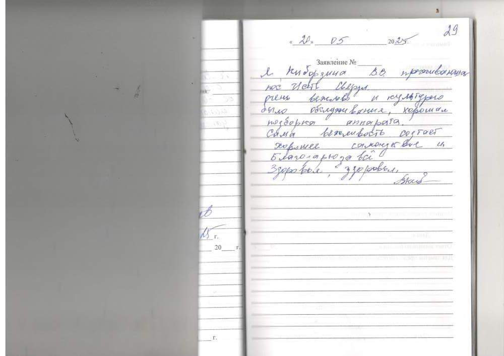 Я, Кибордина ВВ проживающая пос. Исеть Свердл. очень вежливо и культурно было обслуживание, хорошая подборка аппарата. Сама вежливость создает хорошее самочувствие и благодарю за всё. Здоровья, здоровья.
