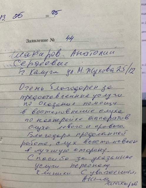 13.05.2025 Шакиров Анатолий Сергеевич Очень благодарен за предоставленные услуги по оказанию помощи в восстановлении слуха по настройке аппаратов левого и правого. Благодаря проделанной работе, слух восстановлен в лучшую сторону. Спасибо за оказанные услуги персоналу клиники. С уважением Шакиров