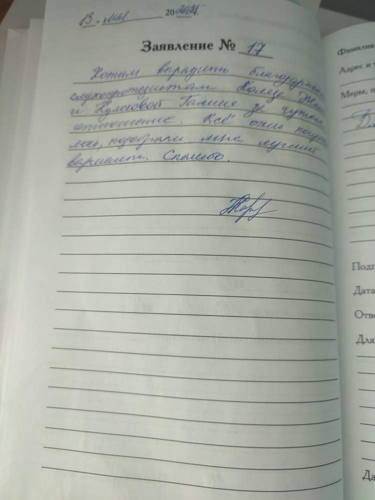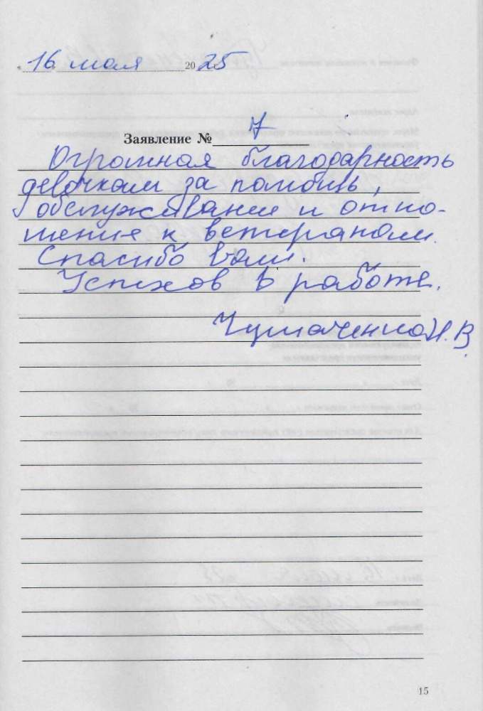Огромная благодарность девочкам за помощь, обслуживание и отношение к ветеранам. Спасибо вам! Успехов в работе.