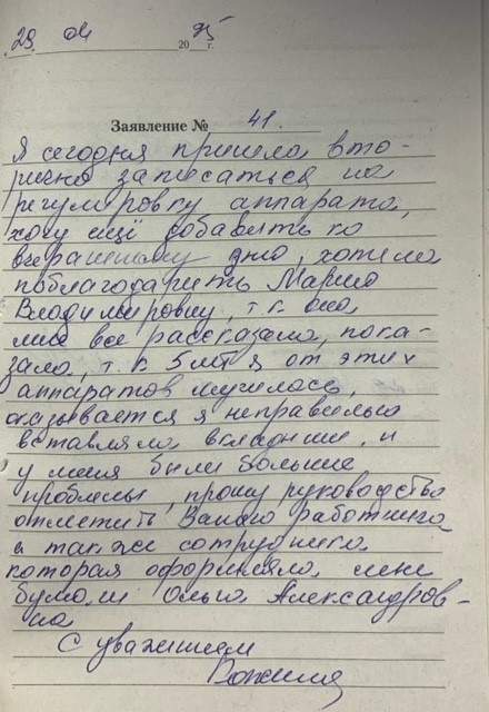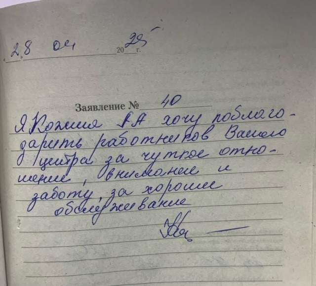 28.04.2025 КОЖИНА АЛЕВТИНА АЛЕКСАНДРОВНА Я, Кожина А.А. хочу поблагодарить работников Вашего центра за чуткое отношение, внимание и заботу, за хорошее обслуживание. 28.04.2025
