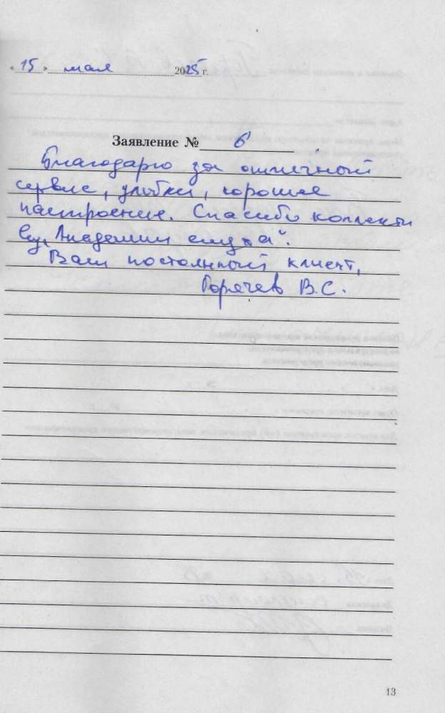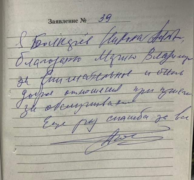 28.04.2025 Бочкарев Николай Павлович Я, Бочкарев Николай Павлович благодарю Марию Владимировну за внимательное и очень доброе отношение при приеме за обслуживанием. Еще раз спасибо за все.