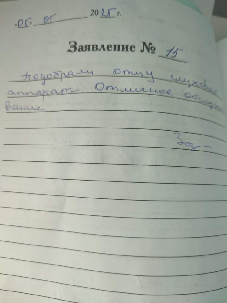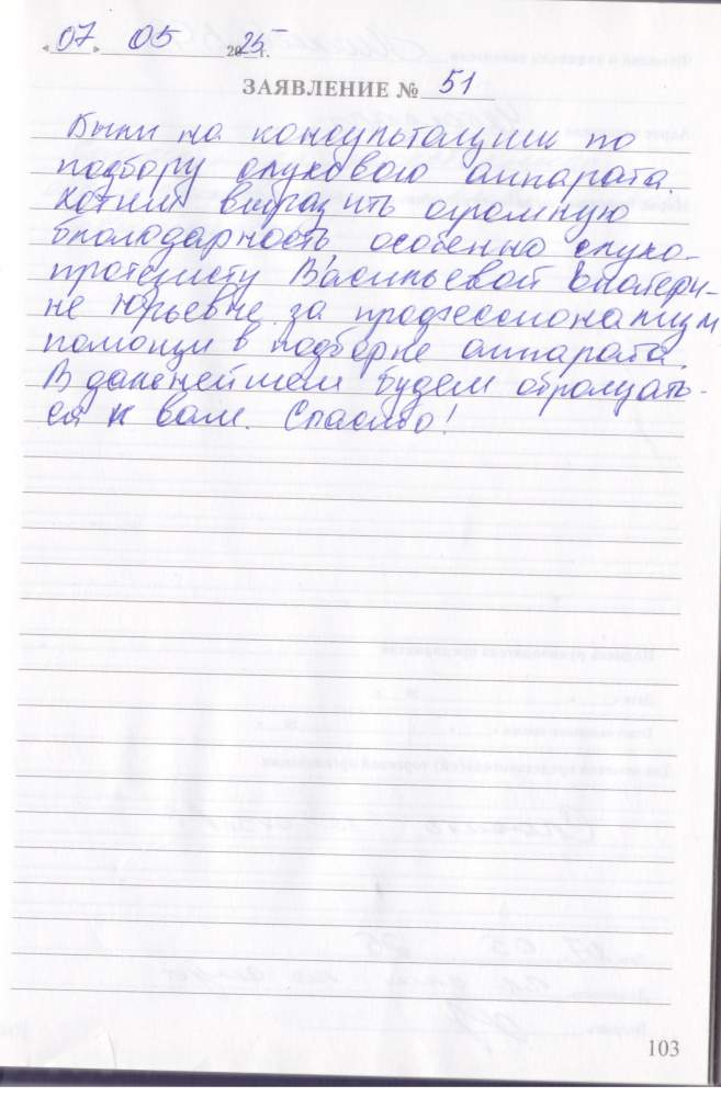 07.05.25 Были на консультации по подбору слухового аппарата. Хотим выразить огромную благодарность, особенно слухопротезисту Васильевой Екатерине Юрьевне за профессионализм помощи в подборе аппарата. В дальнейшем будем обращаться к вам. Спасибо!