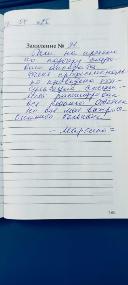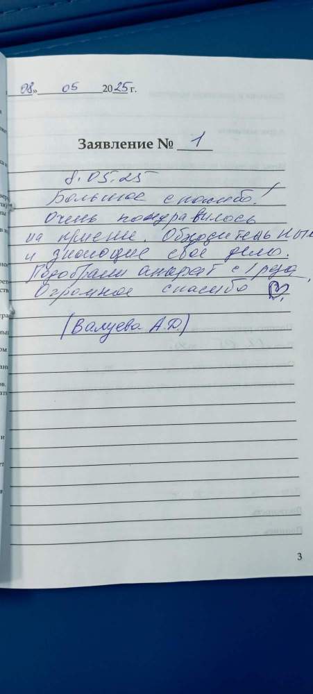 Большое спасибо! Очень понравилось на приеме. Обходительные и знающие свое дело. Подобрали аппарат с 1 раза. Огромное спасибо.