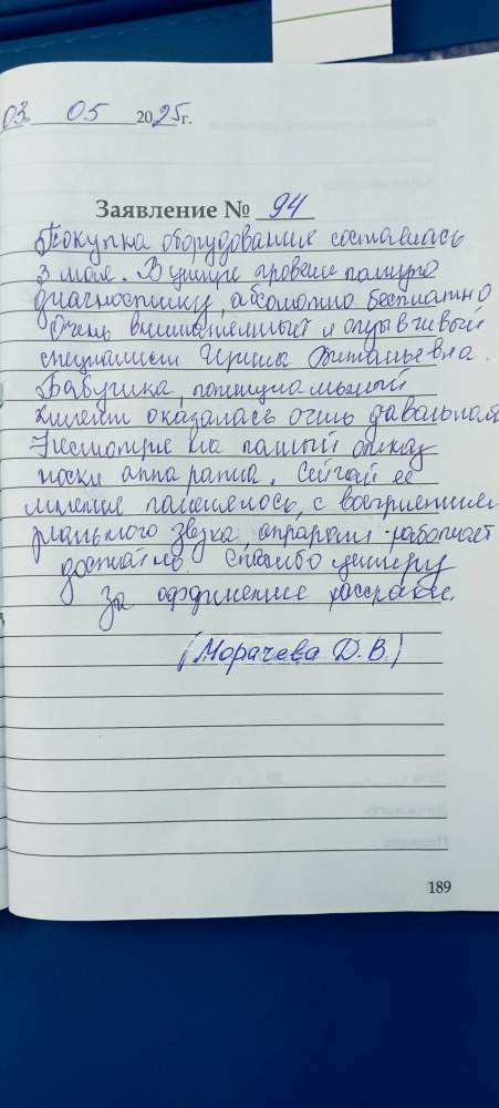 Покупка оборудования состоялась 3 мая. В центре провели полную диагностику, абсолютно бесплатно. Очень внимательный и отзывчивый специалист Ирина Витальевна. Бабушка, потенциальный клиент оказалась очень довольная. Несмотря на полный отказ носки аппарата. Сейчас ее мнение поменялось, с восприятием реального звука, аппарат работает достойно. Спасибо центру за оформление рассрочки.