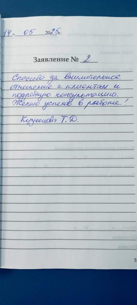 Спасибо за внимательное отношение к клиентам и подробную консультацию. Желаю успехов в работе!