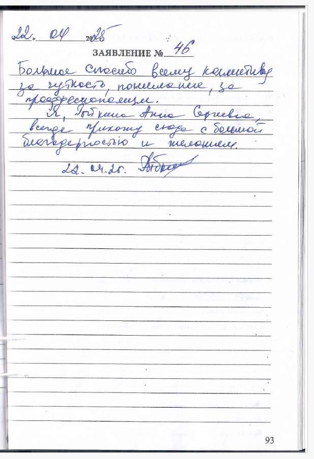 Большое спасибо всему коллективу за чуткость, понимание, за профессионализм. Я, Рыбкина Анна Сергеевна, всегда прихожу сюда с большой благодарностью и желанием.