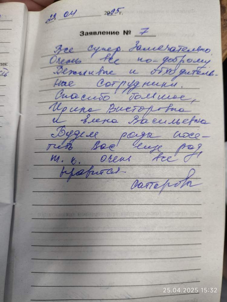 Всё супер-замечательно,очень всё по-доброму.Вежливые и обходительные сотрудники.Спасибо большое Ирина Викторовна и Елена Васильевна.Будем рады посетить Вас ещё раз,т.к.очень всё нравится.Саттаровы.