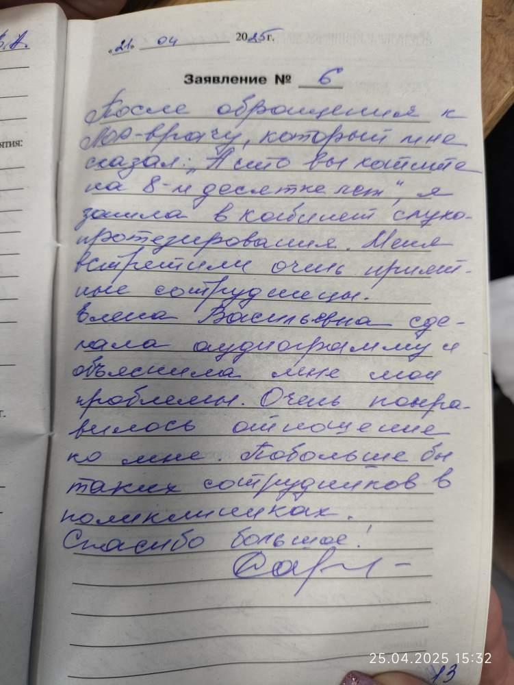 После обращения к лор-врачу,который мне сказал:"А что вы хотите на 8-м десятке лет?",я зашла в кабинет слухопротезирования.Меня встретили очень приятные сотрудницы.Елена Васильевна сделала аудиограмму и объяснила мне мои проблемы. Очень понравилось отношение ко мне.Побольше бы таких сотрудников в поликлиниках.Спасибо большое!