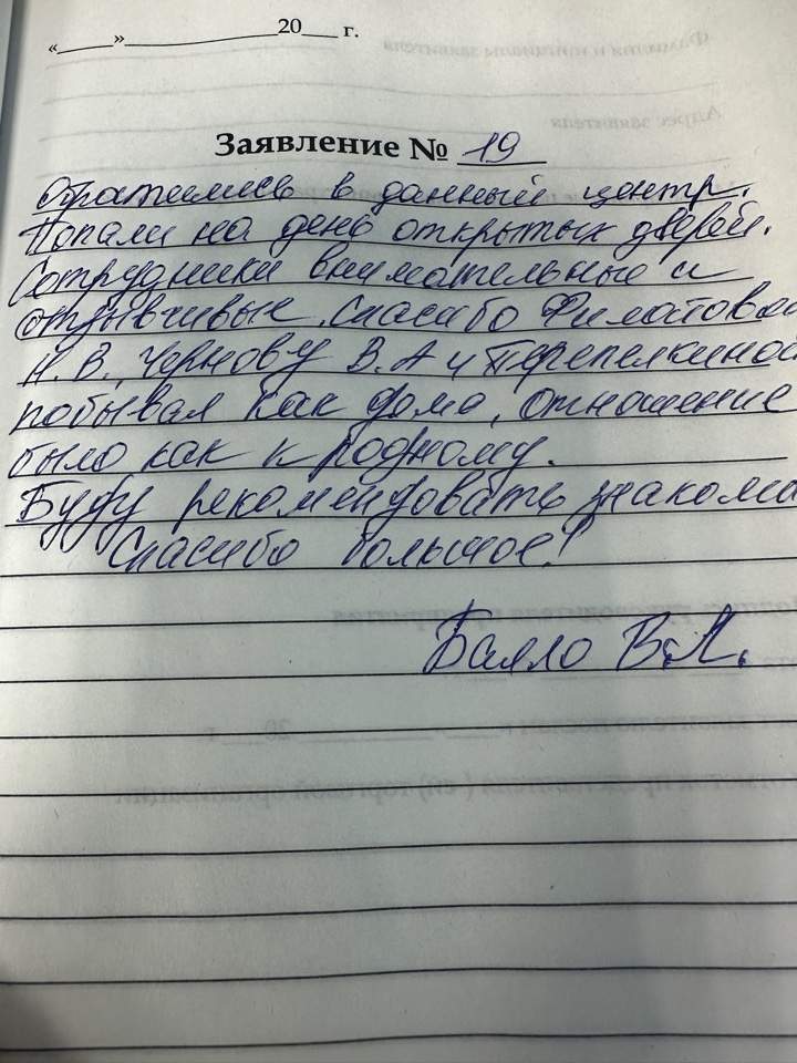 Обратились в данный центр. Попали на день открытых дверей. Сотрудники внимательные и отзывчивые. Спасибо Филатовой Н.В. Чернову В.А. и Перепелкиной Т.Н. Побывал как дома, отношение было как к родному. Буду рекомендовать знакомым. спасибо большое. Балло В.Л.