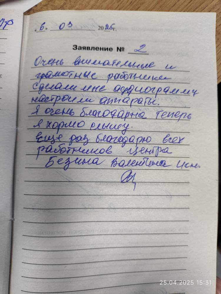 Очень внимательные и грамотные работники,сделали мне аудиограмму настроили аппараты.Я очень благодарна теперь я хорошо слышу.Ещё раз благодарю работников центра.