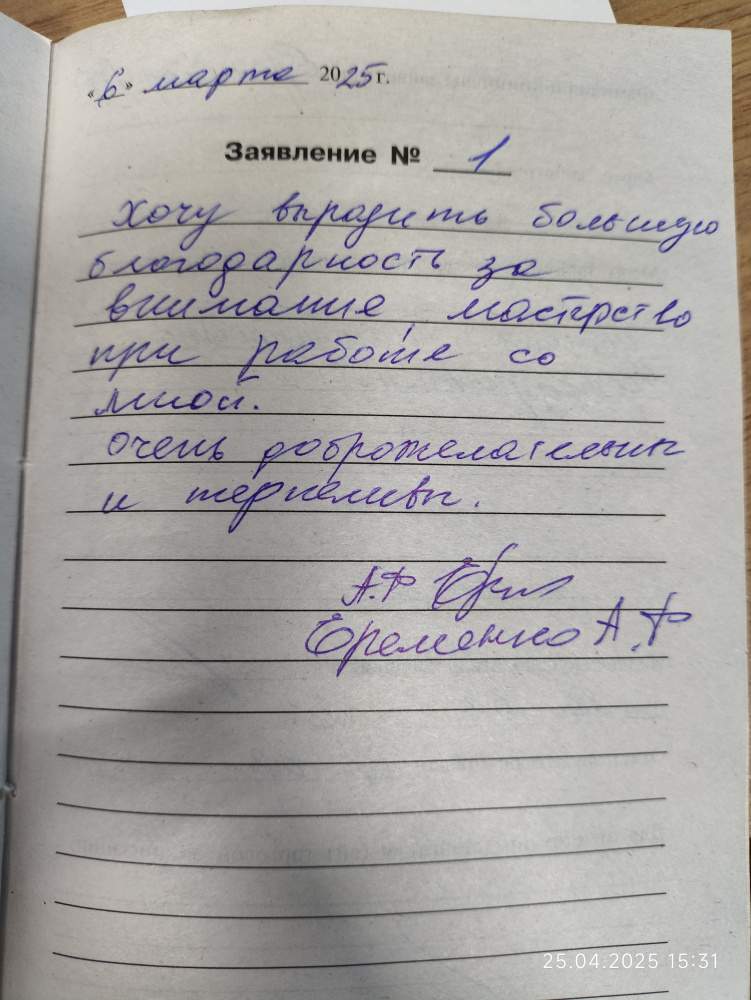 Хочу выразить большую благодарность за внимание, мастерство при работе со мной.Очень доброжелательны и терпеливы.