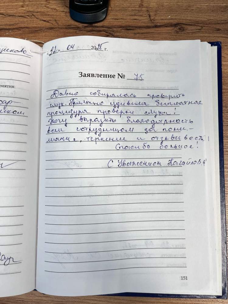 Давно собиралась проверить слух. Приятно удивила бесплатная процедура проверки слуха. хочу выразить благодарность всем сотрудникам за понимание. терпение и отзывчивость. Спасибо большое. С уважением Качайло В.В
