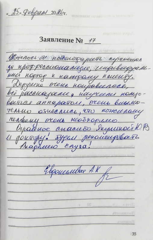 Получила здесь слуховой аппарат, который я ждала целый год. Такого чуткого внимания я нигде не встречала, благодарю за терпение сколько сил нужно отдать больным людям, чтобы они ушли с благодарностью от вас. Особенно доктору Леночке Николаевне, таких докторов давно уже нет. Счастья Вам всем, крепкого здоровья, побольше зарплату и всего доброго что есть на свете. Вы этого заслуживаете. С уважением, Сорокина А.И